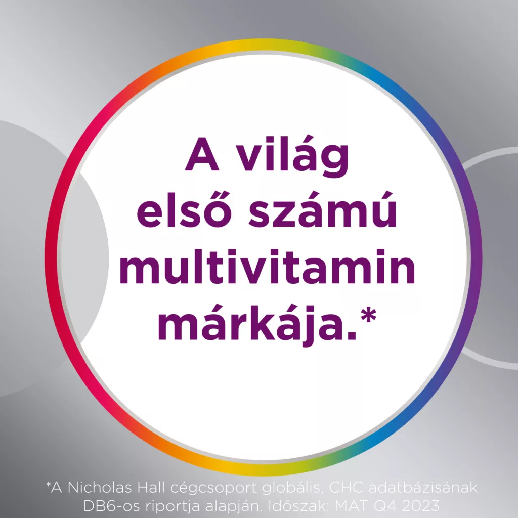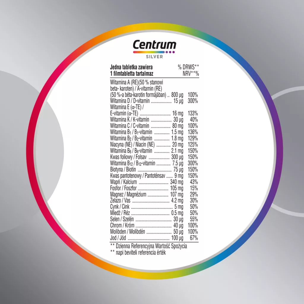 1 filmtabletta tartalmaz: A-vitamin (RE) (50%-a béta-karotin formájában): 800 μg, D-vitamin: 15 μg, E-vitamin (α-TE): 16 mg, K-vitamin: 30 μg, C-vitamin : 80 mg, B₁-vitamin: 1,5 mg, B₂-vitamin: 1,8 mg, Niacin (NE) : 20 mg, B₆-vitamin: 2,1 mg, Folsav: 300 μg, B₁₂-vitamin: 7,5 μg, Biotin: 75 μg, Pantoténsav: 9 mg, Kalcium: 340 mg, Foszfor: 105 mg, Magnézium: 107 mg, Vas: 4,2 mg, Cink: 5 mg, Réz: 0,5 mg, Szelén: 30 μg, Króm: 40 μg, Molibdén: 50 μg, Jód: 100 μg, ** napi beviteli referenciaértékNRV**%: A-vitamin (RE) (50%-a béta-karotin formájában): 100%, D-vitamin: 300%, E-vitamin (α-TE): 133%, K-vitamin: 40%, C-vitamin : 100%, B₁-vitamin: 136%, B₂-vitamin: 129%, Niacin (NE) : 125%, B₆-vitamin: 150%, Folsav: 150%, B₁₂-vitamin: 300%, Biotin: 150%, Pantoténsav: 150%, Kalcium: 43%, Foszfor: 15%, Magnézium: 29%, Vas: 30%, Cink: 50%, Réz: 50%, Szelén: 55%, Króm: 100%, Molibdén: 100%, Jód: 67%, ** napi beviteli referenciaérték