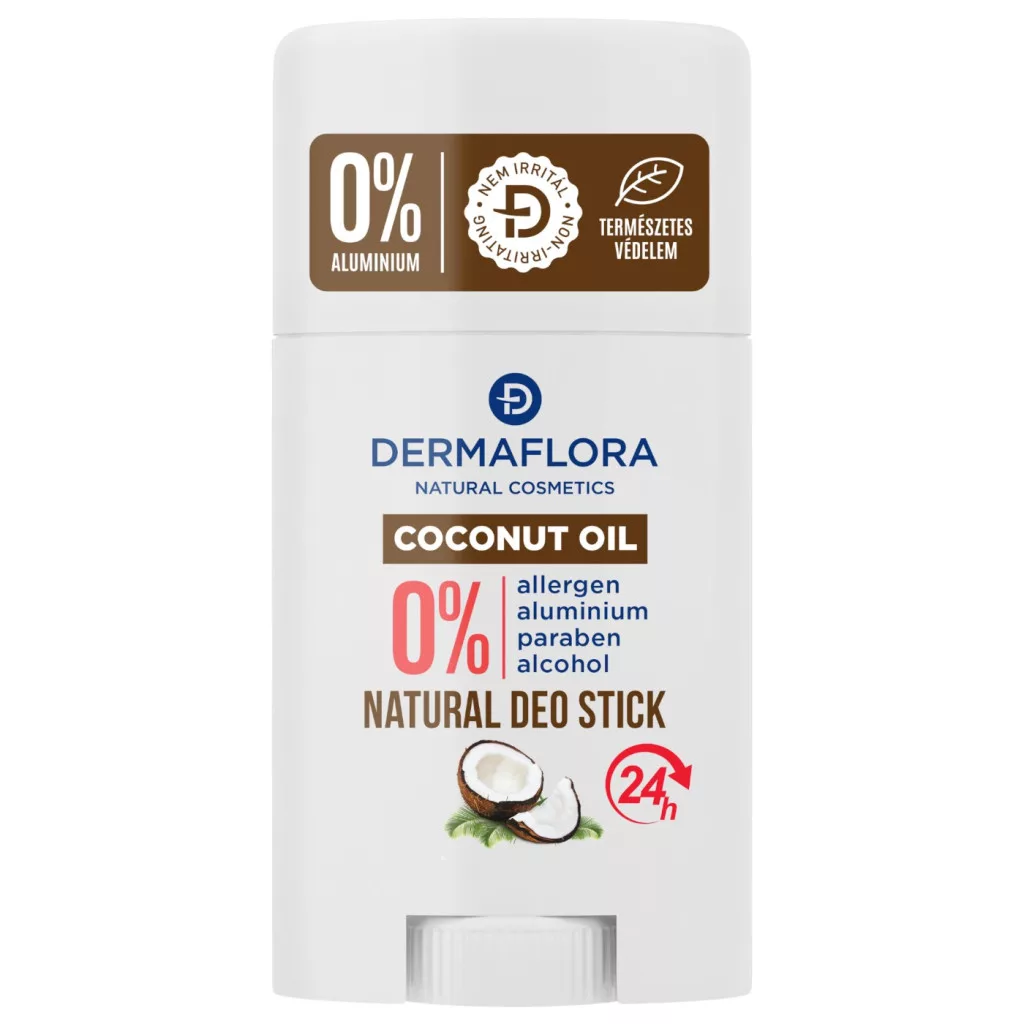 A Dermaflora Natural Cosmetics 0% Coconut oil stift kellemes kókuszos illatot biztosít egész napon át. A kókuszolaj magas laurinsav tartalma baktérium-, vírus- és gombaellenes hatásokkal bír. A természetes anyagoknak köszönhetően nem okoz irritációt és nem hagy foltot a ruhán. Nem tartalmaz alumíniumot, allergént, parabént és alkoholt.