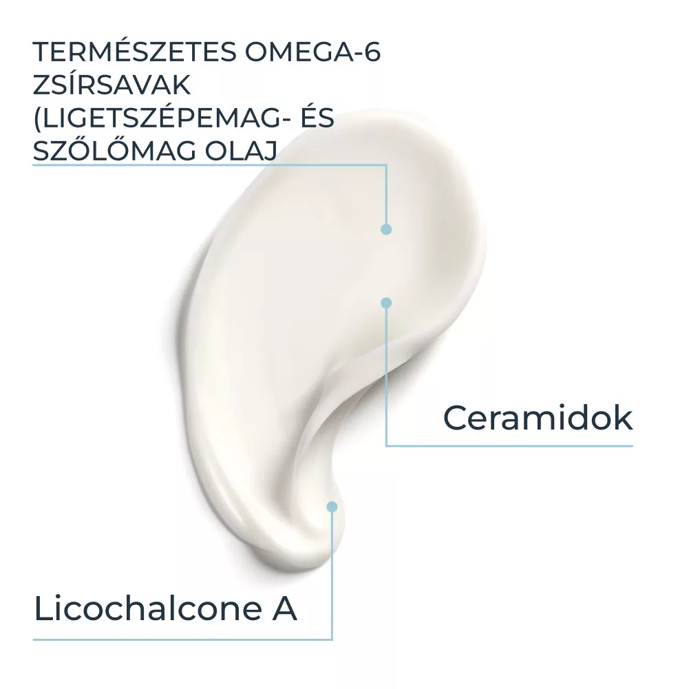Erősíti a bőr védőrétegét: A formula gazdag licochalcone A-ban, amely gyulladáscsökkentő és bőrnyugtató hatásáról ismert. A ceramidok visszaállítják a bőr természetes barrierjét, míg a shea vaj mély táplálást biztosít, puhítja és erősíti a bőrt.
