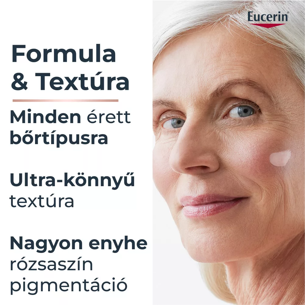 Az Eucerin Hyaluron-Filler + Elasticity Rose SPF30 nappali arckrém azonnali rózsás ragyogást ad a fakó, fáradt arcbőr ellensúlyozására, miközben csökkenti az öregségi foltokat, feltölti a mély ráncokat és növeli a bőr rugalmasságát. Anti-aging formulája szabadalmaztatott Thiamidolt, hialuronsavat és kollagén–elasztin komplexet tartalmaz. Mikroműanyag-mentes, oktokrilénmentes UV-szűrőrendszerrel és SPF30 védelemmel.