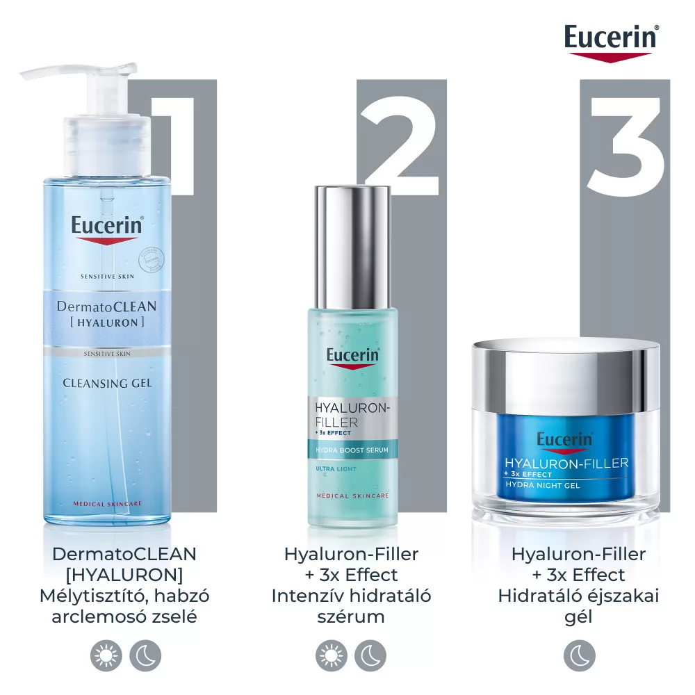 Az Eucerin Hyaluron-Filler ráncfeltöltő hidratáló éjszakai arcgél kifejezetten az első ráncok és a bőr éjszakai dehidratáltsága ellen lett kifejlesztve. Ultrakönnyű, gyorsan felszívódó textúrája intenzív és hosszan tartó hidratálást biztosít, miközben alvás közben aktívan támogatja a bőr természetes megújulási folyamatait.