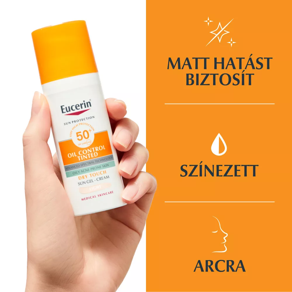 Az Eucerin Sun Oil Control színezett napozó gél-krém arcra light SPF50+ mindennapos használatra szánt, színezett fényvédő, amely hatékony védelmet és esztétikus megjelenést biztosít egyszerre. Ultrakönnyű, nem zsíros formulája a zsíros, aknéra hajlamos bőr igényeihez igazodik.