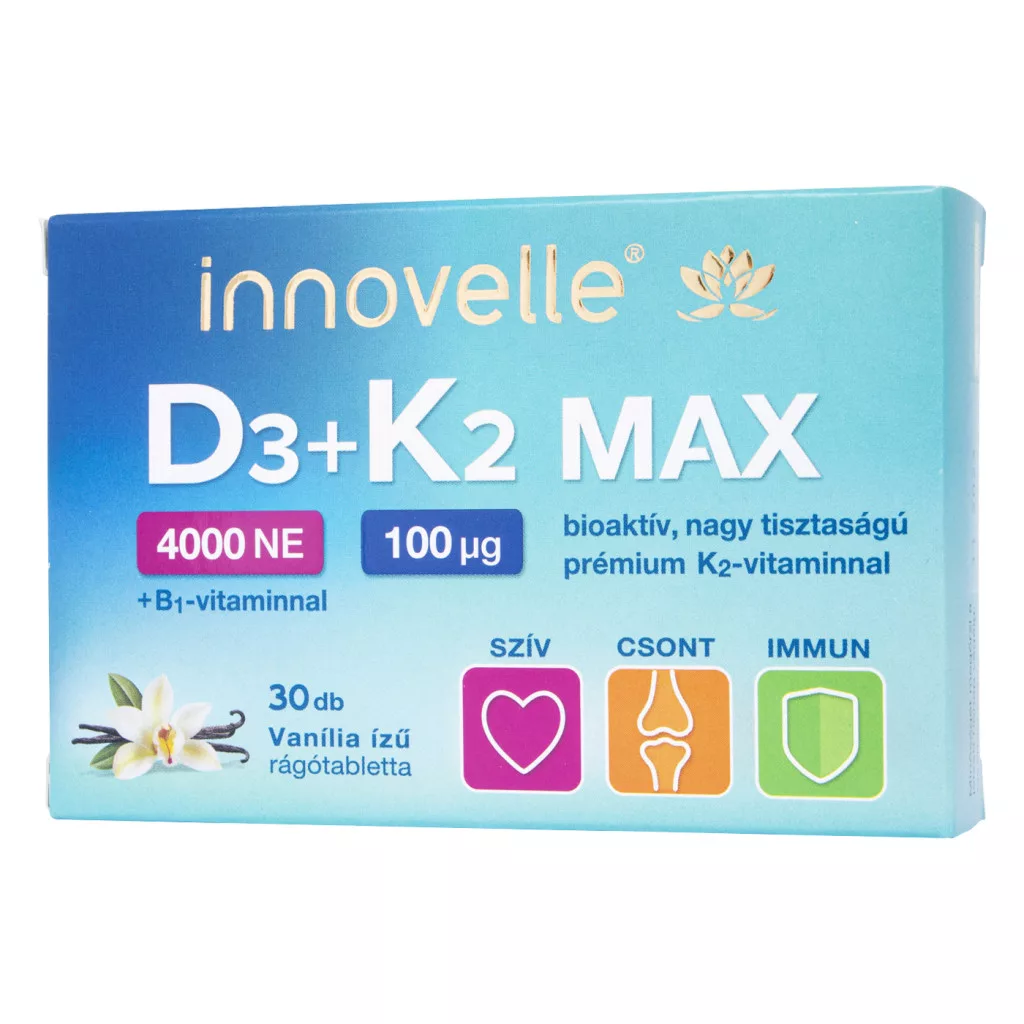 Az Innovelle D3 + K2 MAX vanília ízű rágótabletta nagy mennyiségben tartalmaz D-vitamint és bioaktív, nagy tisztaságú prémium K2-vitamint.