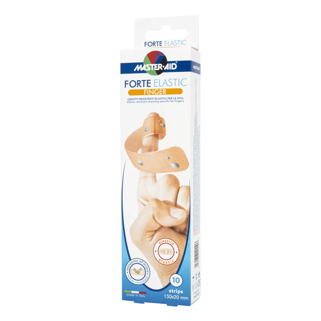 A Master-Aid Forte Elastic Finger vízálló rugalmas sebtapasz használata javasolt a bőr felszíni sérülésekor. Hatékony védelmet biztosít erős igénybevétel és szélsőséges környezeti hatások mellett is. Ideális kisebb sebek ellátására.