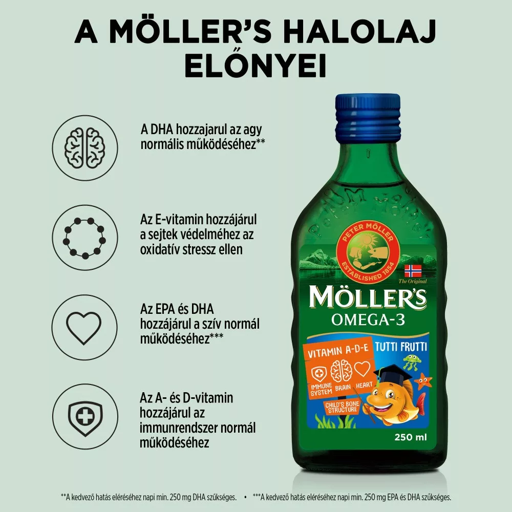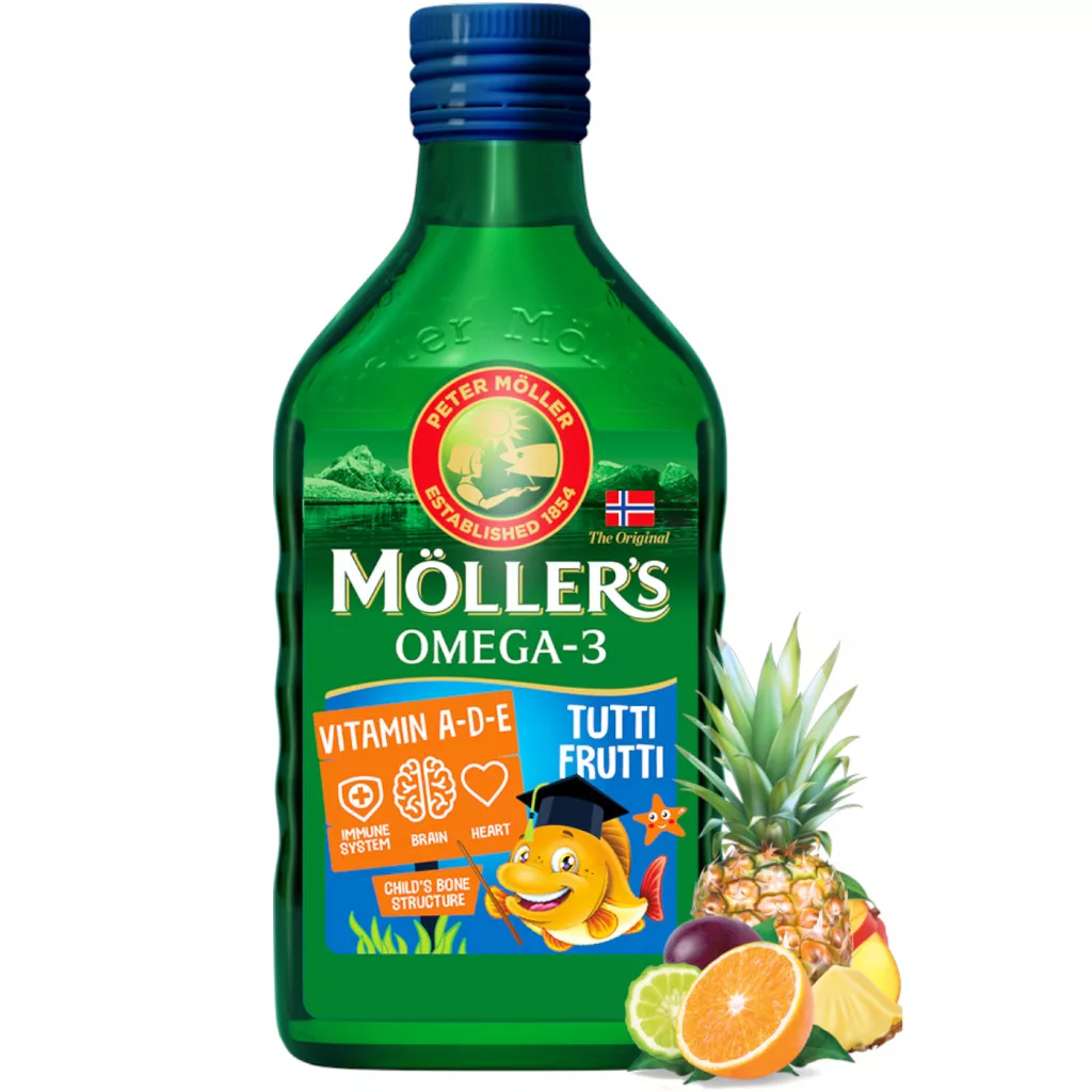 A Möller’s tutti-frutti ízű halolaj természetes forrásból származó omega-3 zsírsavakat tartalmazó, tőkehalmájból készült étrend-kiegészítő, amelyet kifejezetten gyerekek számára fejlesztettek ki. Az A-, D- és E-vitaminnal kiegészített összetétel kellemes tutti-frutti ízzel párosul.