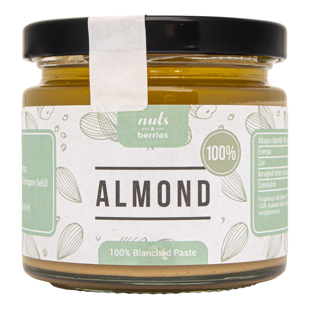 A Nuts & Berries mandulakrém összetétele 100% pörkölt mandula, nem tartalmaz semmiféle tartósítószert, mesterséges színezéket, vagy bármilyen más adalékanyagot.