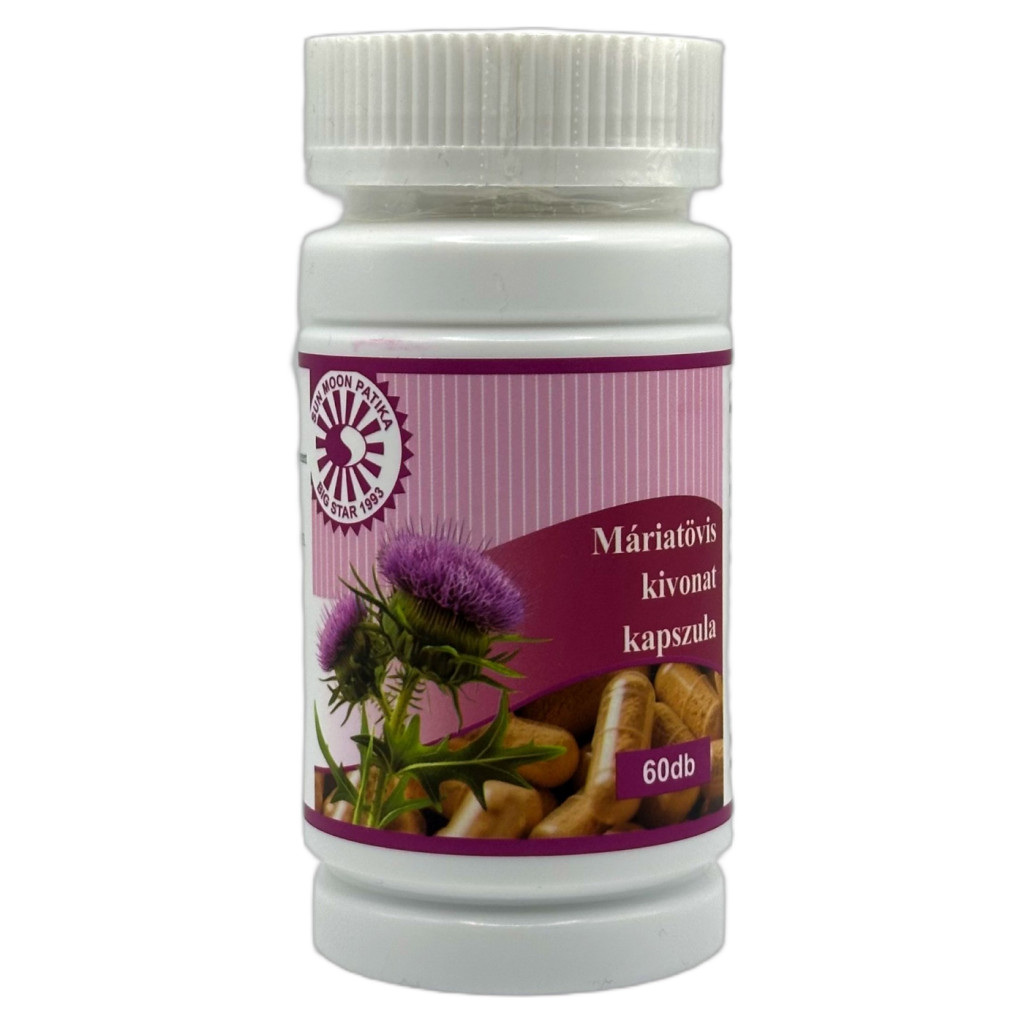 A Sun Moon Máriatövis kivonat kapszula standardizált máriatövis termés kivonatot tartalmaz magas silymarin hatóanyag-tartalommal. A silymarin egy növényi flavonolignán-komplex, amely hozzájárulhat a máj normál működésének fenntartásához, valamint támogatja a máj természetes méregtelenítő folyamatait és antioxidáns védelmét.