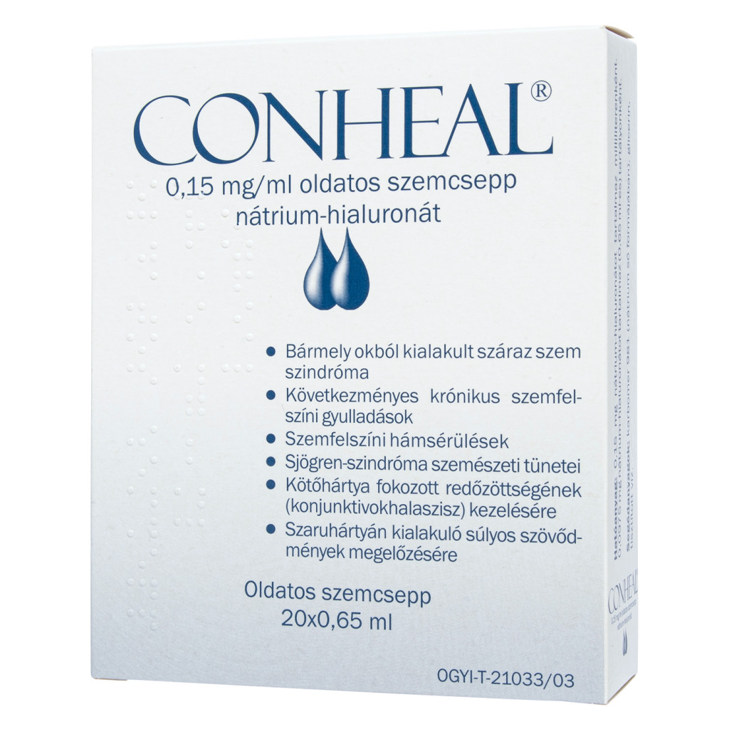 A Conheal szemcsepp nátrium-hialuronát-tartalmú műkönnykészítmény, mely alkalmazható a bármely okból kialakult száraz szem szindróma, a következményes idült szemfelszíni gyulladások, szemfelszíni hámsérülések, a Sjögren-szindróma szemészeti tüneteinek és a kötőhártya fokozott redőzöttségének (úgynevezett konjunktivokhalaszisz) kezelésére, valamint a szaruhártyán kialakuló súlyos szövődmények megelőzésére.