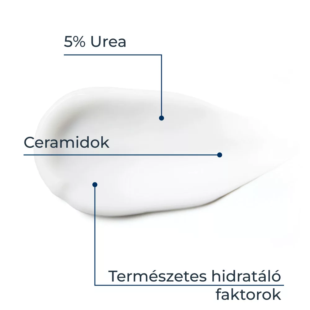 – Intenzív és hosszan tartó hidratálás: A krém formulájában található 5% karbamid, valamint a ceramidok és természetes hidratáló faktorok (NMF) hatékonyan növelik a bőr nedvességtartalmát. Klinikailag igazolt, hogy a termék 48 órán át hidratál, és azonnal nyugtatja a kiszáradt, irritált vagy ekcémás kezeket.