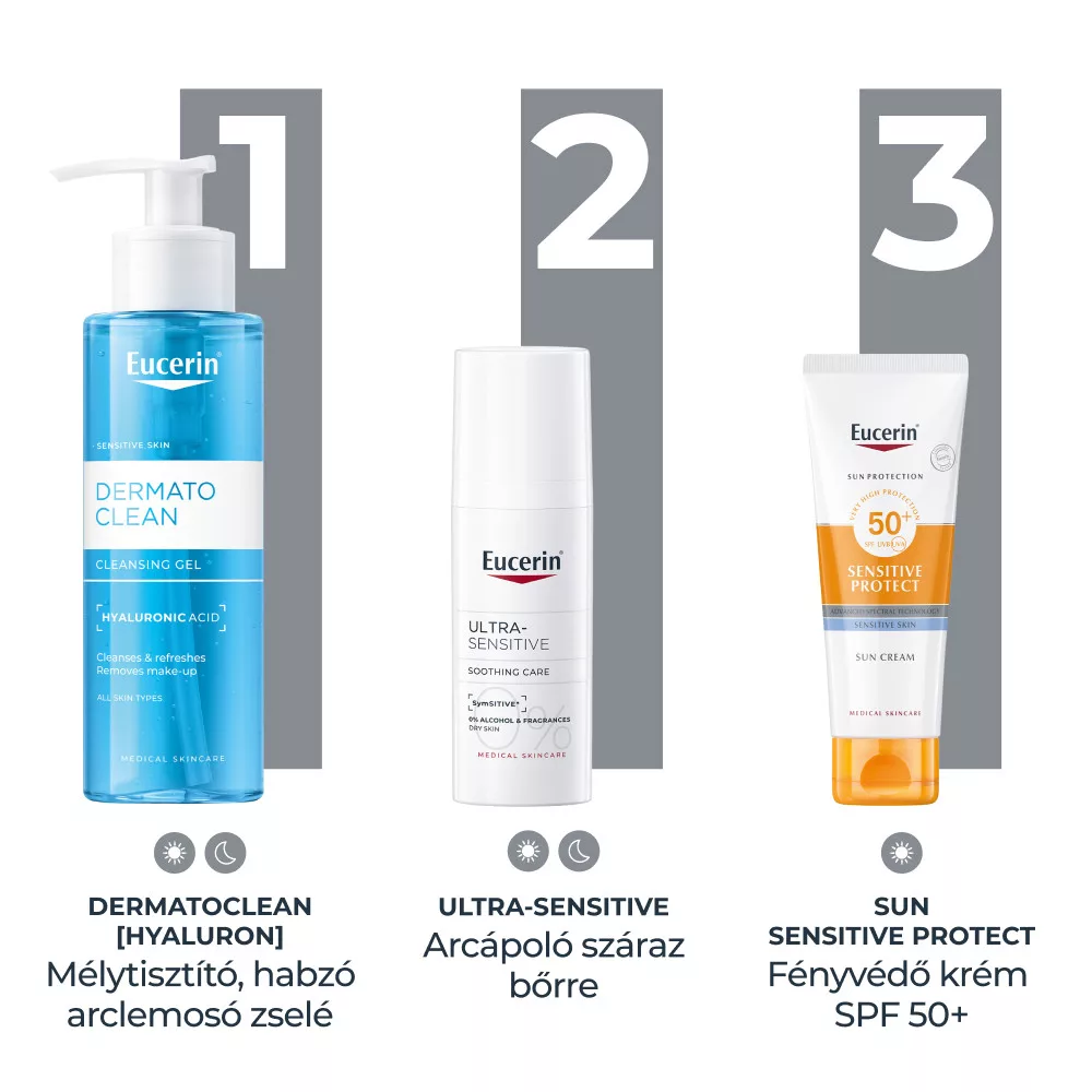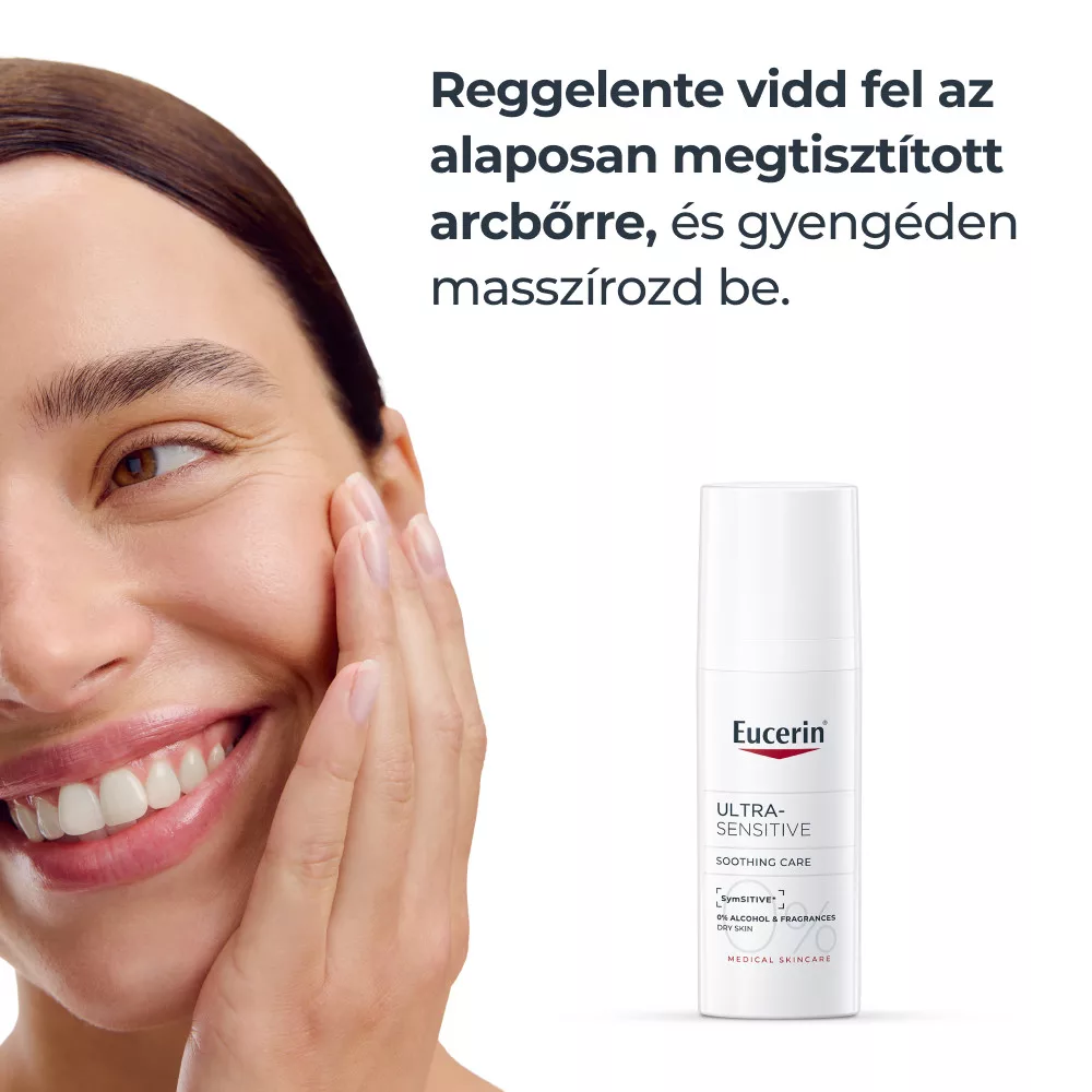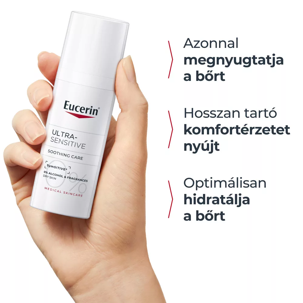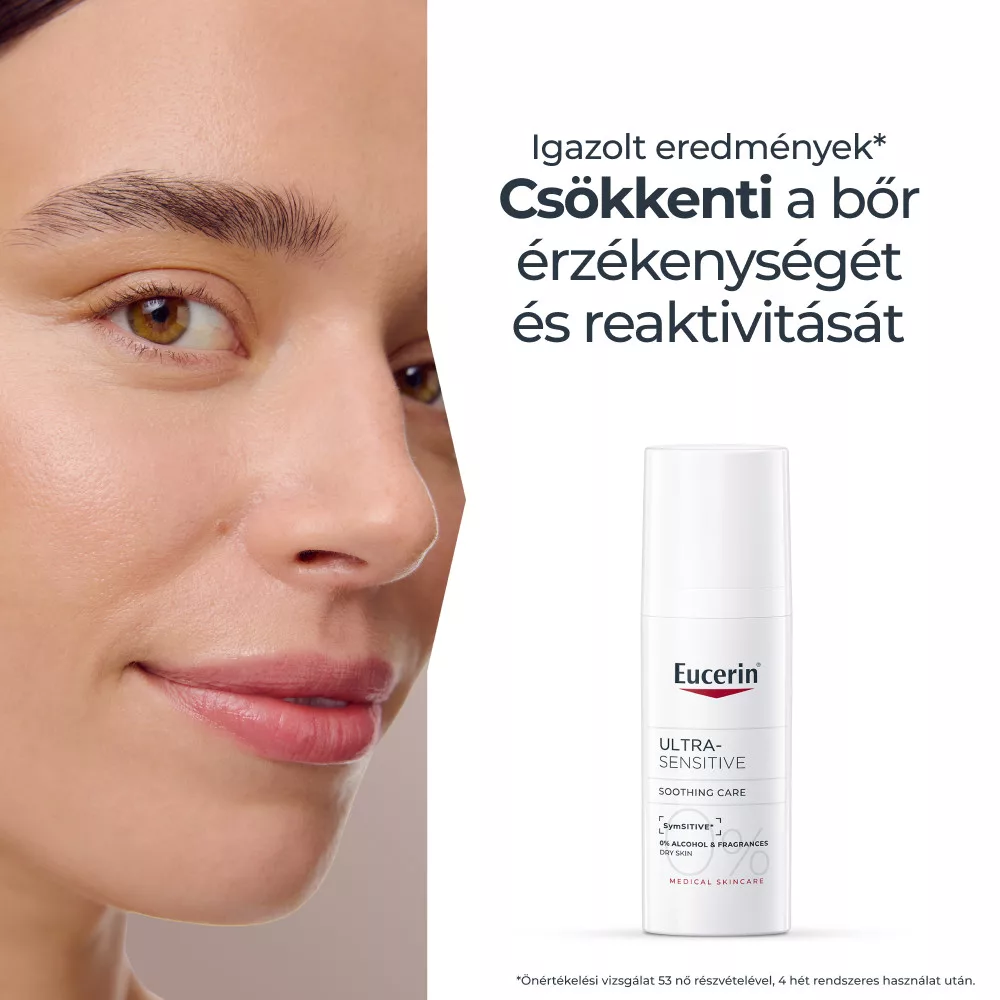 Az Eucerin UltraSensitive arcápoló krém száraz bőrre könnyű állagú formula, amely SymSitive* hatóanyagot tartalmaz. Ez az innovatív összetevő közvetlenül a bőr túlzott reakciókészségének forrásánál hat, így azonnali bőrnyugtatást biztosít. A SymSitive kifejezetten a hiperérzékeny bőr intenzív diszkomfortérzetének enyhítésére lett kifejlesztve.