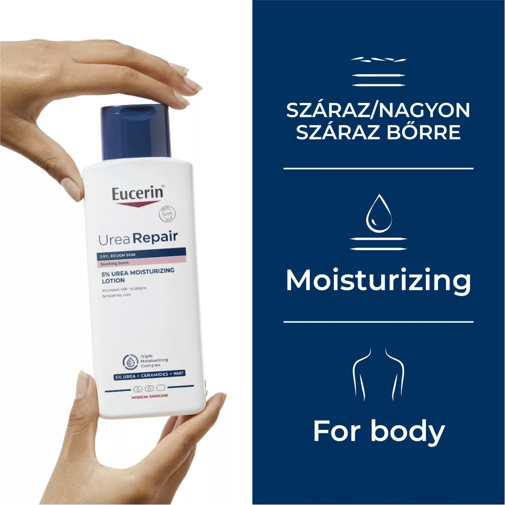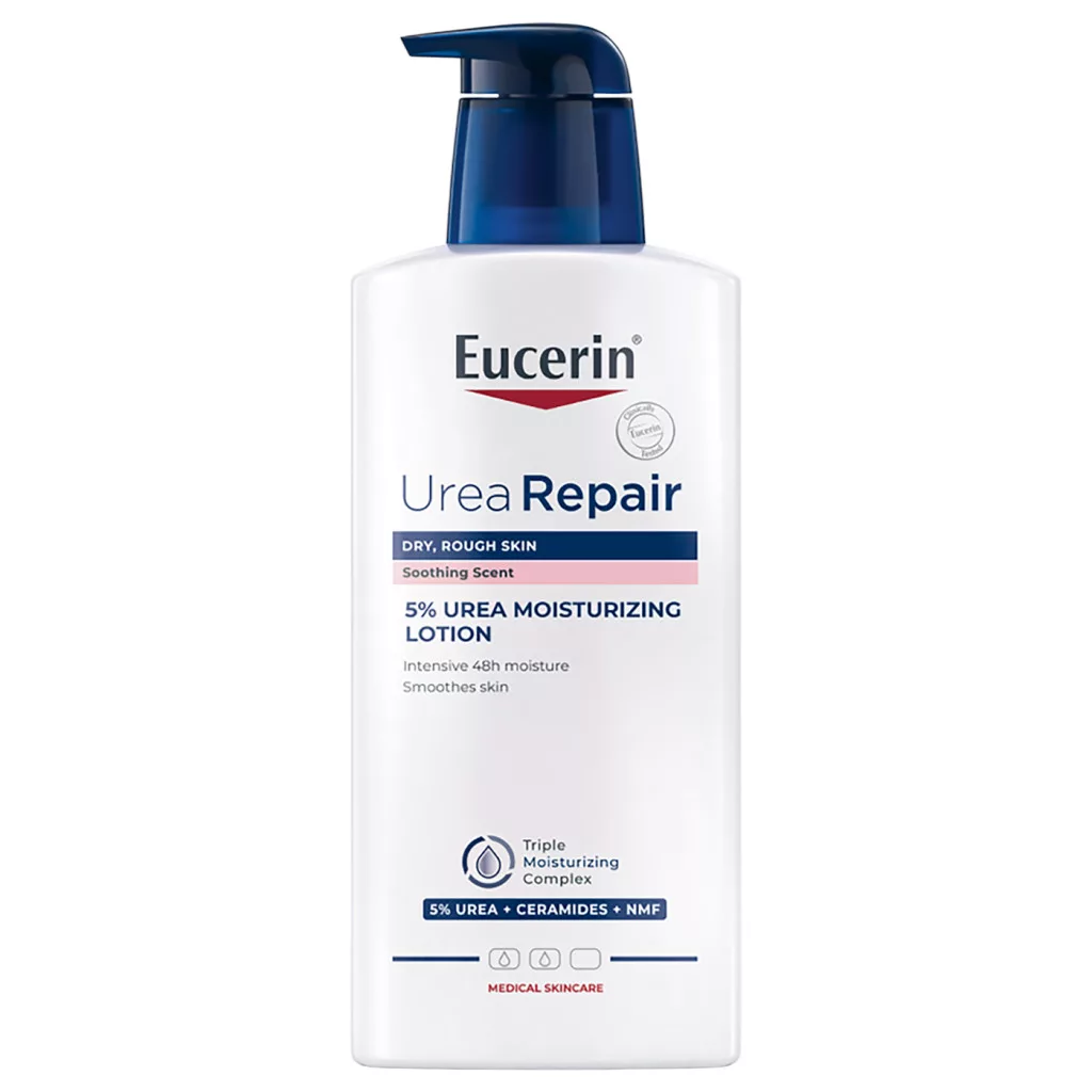 Az Eucerin UreaRepair 5% Urea illatosított testápoló könnyű, mégis hatékony formulájával célzott ápolást nyújt a száraz, érdes bőr számára. Hármas hidratáló komplexe azonnali komfortérzetet biztosít, miközben támogatja a bőr természetes védőrétegét.