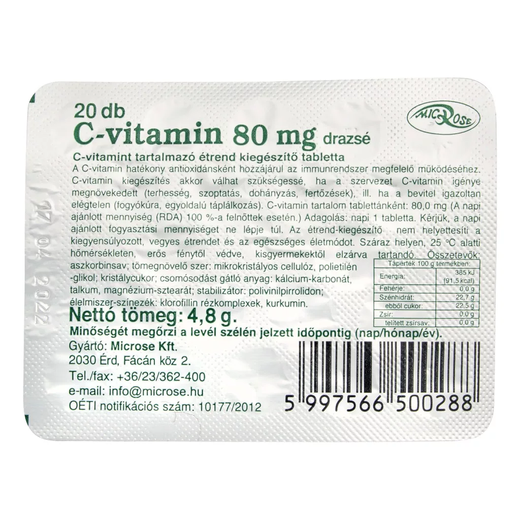 A Microse C-Vitamin Drazsé 80 mg egy egyszerű és kényelmes módja annak, hogy pótolja napi C-vitamin szükségletét. A C-vitamin rendkívül fontos antioxidáns, amely hozzájárul az immunrendszer normál működéséhez és segíthet a fáradtság csökkentésében, így biztosítva a mindennapi vitalitást.